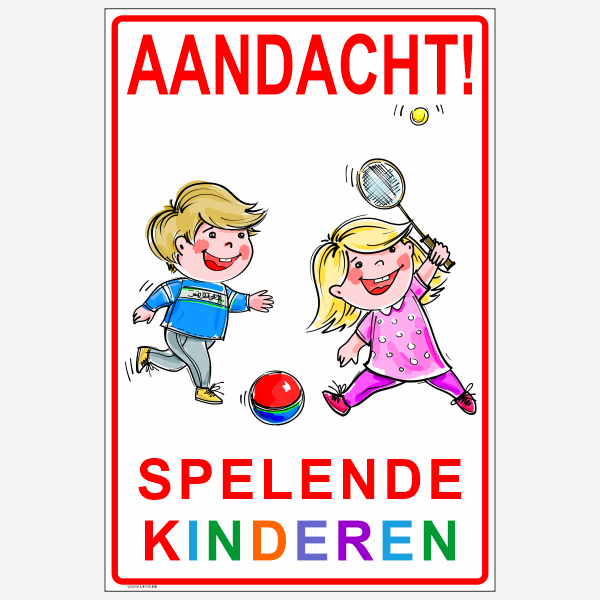 Aandacht! TRAAG RIJDEN Spelende kinderen, rood-witte achtergrond