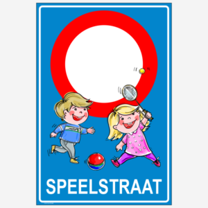 Aandacht! TRAAG RIJDEN Spelende kinderen, rood-witte achtergrond