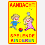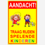 Aandacht! TRAAG RIJDEN Spelende kinderen, rood-gele achtergrond, v3