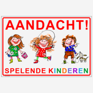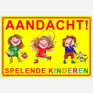 Aandacht! TRAAG RIJDEN Spelende kinderen, rood-gele achtergrond