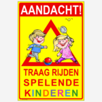 Aandacht! TRAAG RIJDEN Spelende kinderen, rood-gele achtergrond, v3